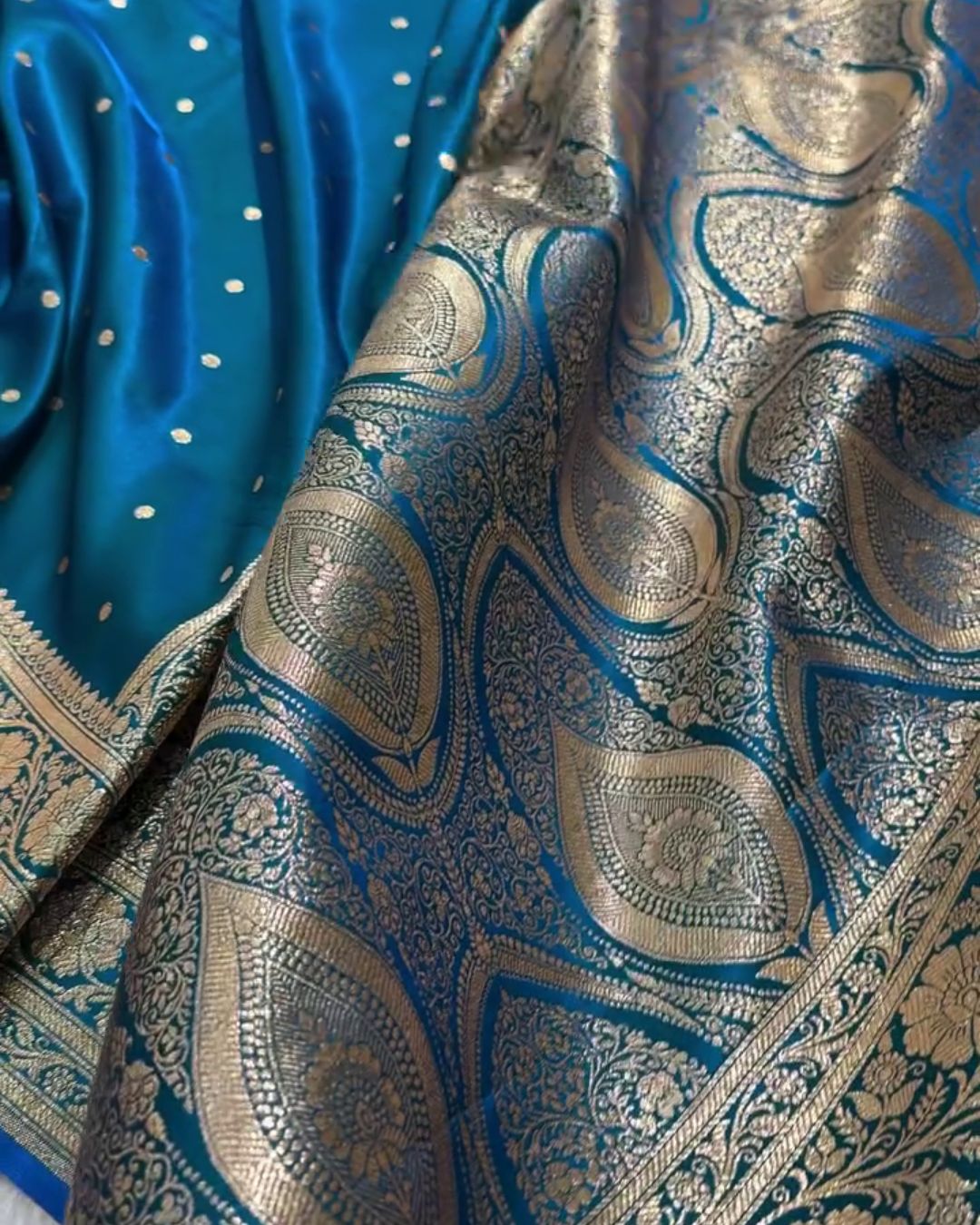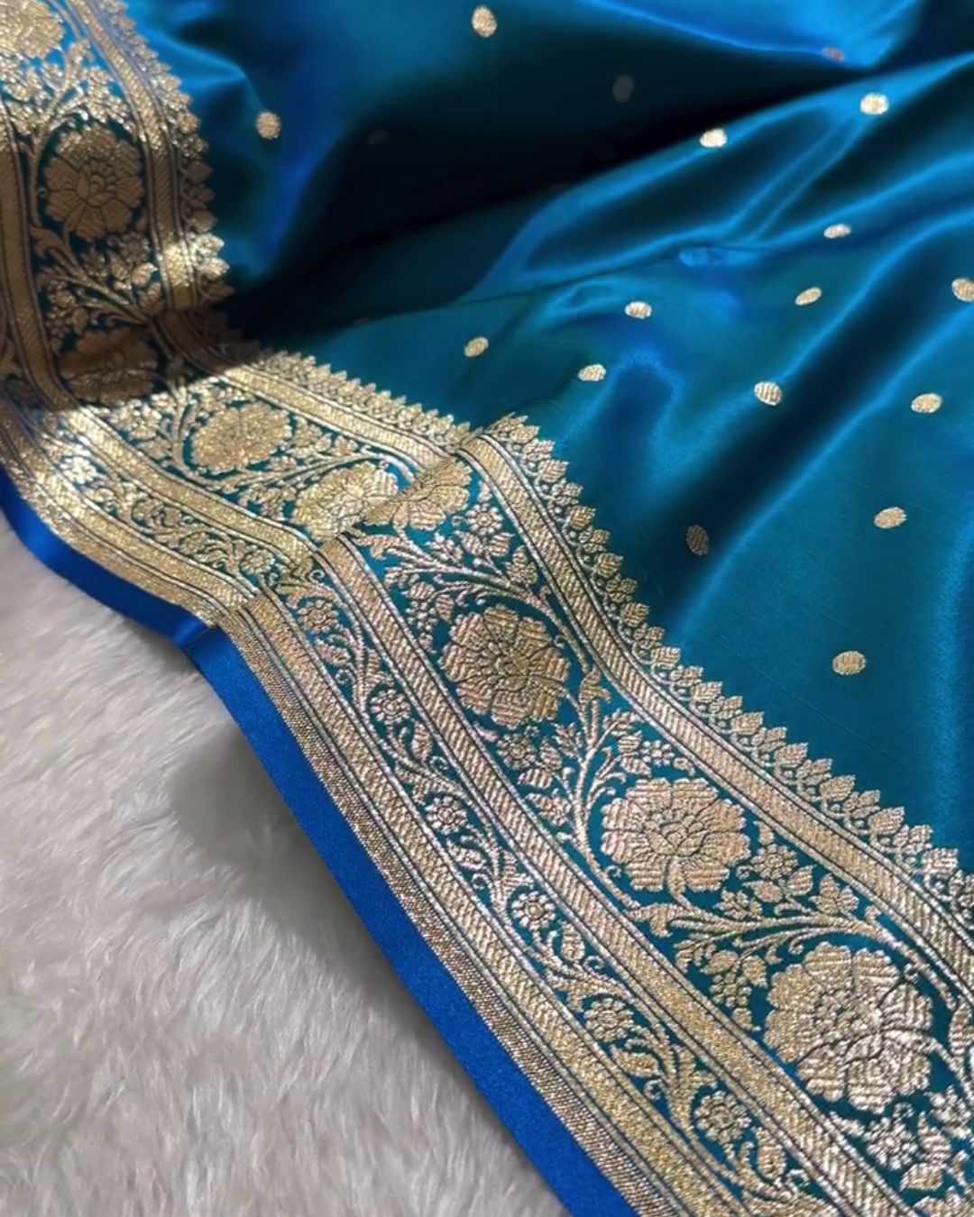 Rich blue Katan silk Banarasi saree featuring zari boota motifs and a floral zari border. Comes with an unstitched blouse piece.