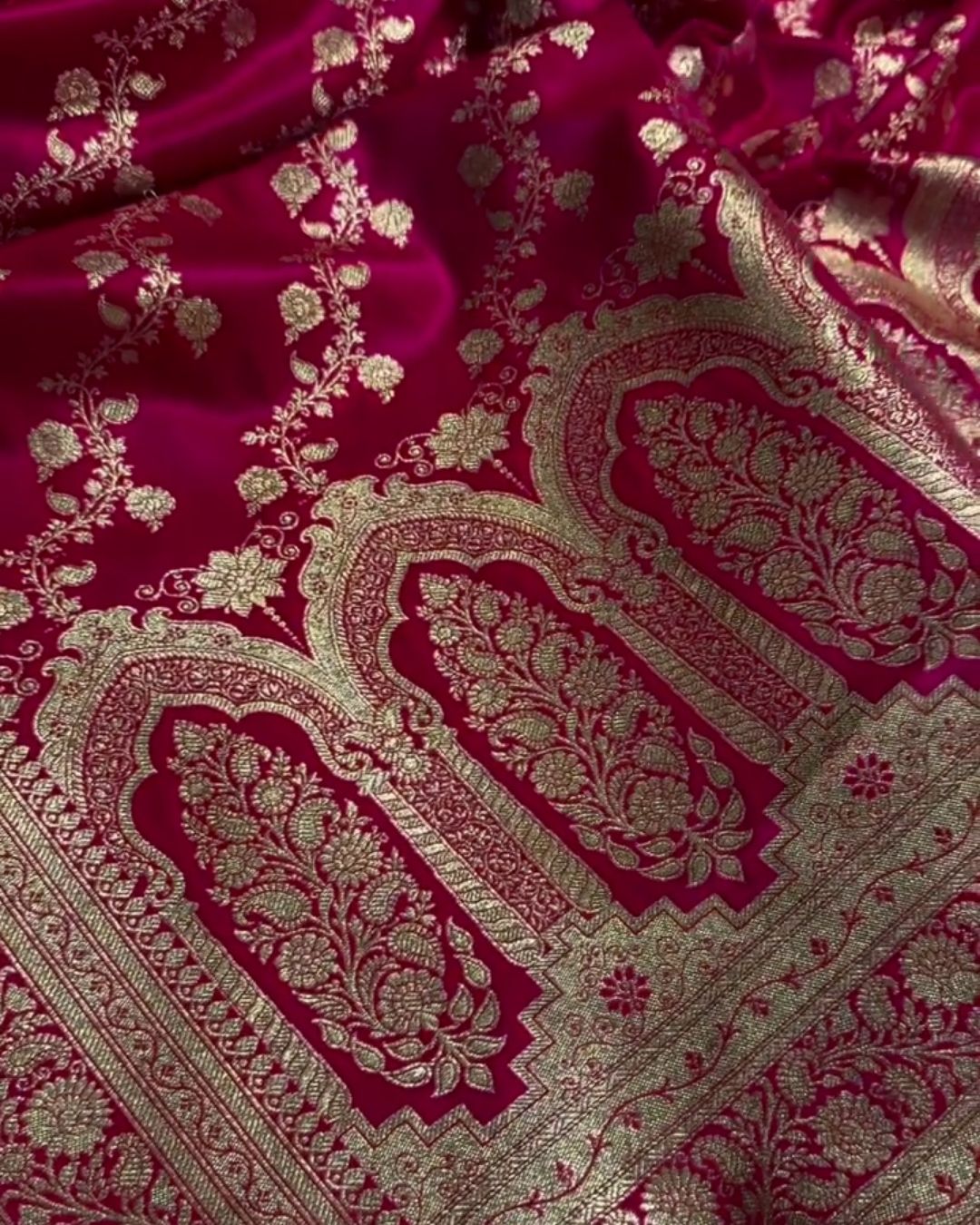 Rich magenta Banarasi satin saree adorned with golden zari floral motifs and elegant temple-inspired border. Comes with an unstitched blouse piece.