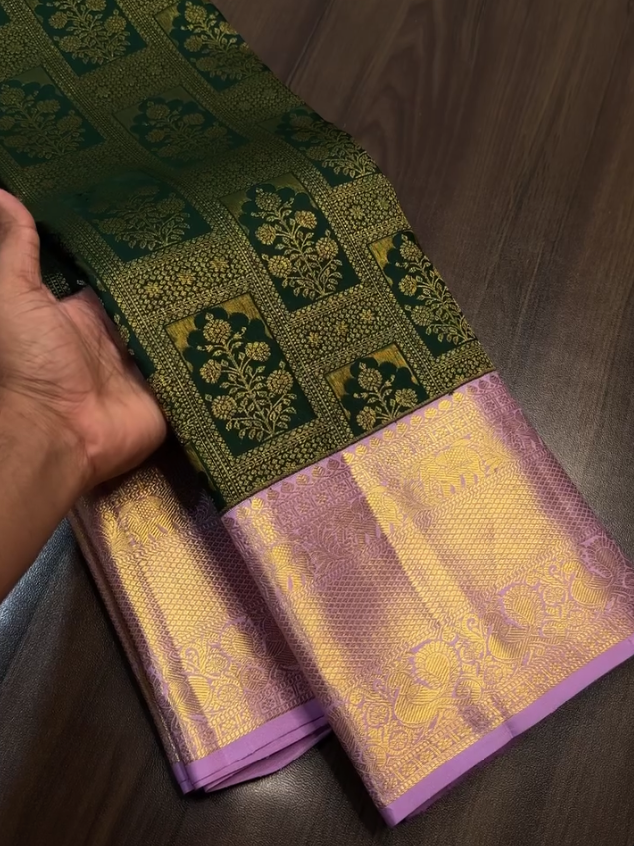 Classic dark green Katan silk saree featuring gold zari floral jaal weave and a soft pink contrast border. Comes with an unstitched blouse piece.